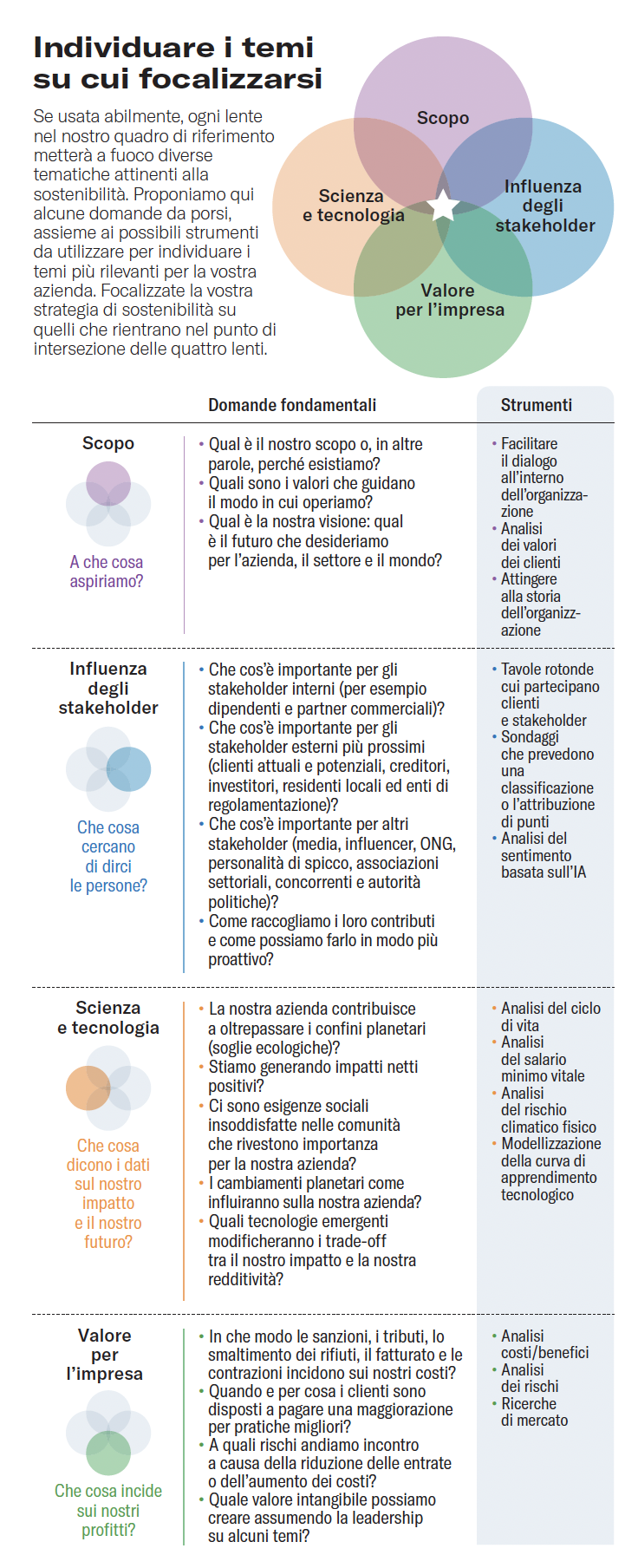 La sostenibilità è un terreno difficile e dinamico in cui muoversi. Le aziende devono fare i conti con mutamenti continui nelle priorità e preoccupazioni degli stakeholder, nel consenso scientifico, nei costi di approvvigionamento e nelle preferenze dei clienti che accrescono il valore per l’impresa. Possono inoltre reinterpretare il loro stesso scopo a seguito di fusioni o cambiamenti nella dirigenza. Di conseguenza, le quattro lenti non forniscono una visione fissa e stabile della strategia di sostenibilità aziendale, ma possono aiutare a mettere a fuoco i temi rilevanti e fare chiarezza in momenti complicati, dando alle aziende la fiducia per perseverare, innovare e porsi all’avanguardia negli ambiti ai quali tengono maggiormente.
