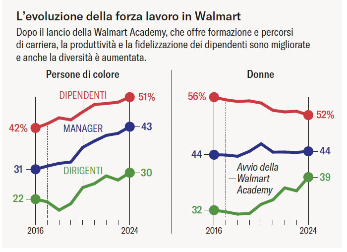 L’Academy ebbe un impatto positivo anche sulle donne presenti in Walmart. Negli anni 2010, uomini che non riuscivano più a trovare lavoro nel settore manifatturiero statunitense cominciarono a cercare impiego nel retail. Di conseguenza, tra il 2016 e il 2024 la percentuale complessiva di donne nella forza lavoro di Walmart scese dal 56% al 52%. Tuttavia, nello stesso periodo, le donne manager mantennero le loro posizioni e il numero di dirigenti aumentò in modo significativo, dal 32% al 39% (vedi il box “L’evoluzione della forza lavoro in Walmart”).