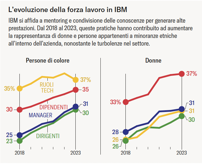 Ginni Rometty, che ne prese il posto, condivideva l’impegno sul mentoring e l’importanza dello scambio di conoscenze. Quando nel 2018 iniziò a pubblicare i dati sulla diversità in IBM, emerse che l’azienda era avanti rispetto alla maggior parte del settore per quanto riguardava la presenza di donne nei ruoli tech, manageriali e dirigenziali: un altro esempio di come un management orientato all’eccellenza favorisca la diversità. Nei cinque anni successivi, IBM vide crescere costantemente la percentuale di donne in tutte e tre le tipologie di ruolo, anche quando durante la pandemia il settore nel suo complesso perdeva quote femminili (si veda il box “L’evoluzione della forza lavoro in IBM”).