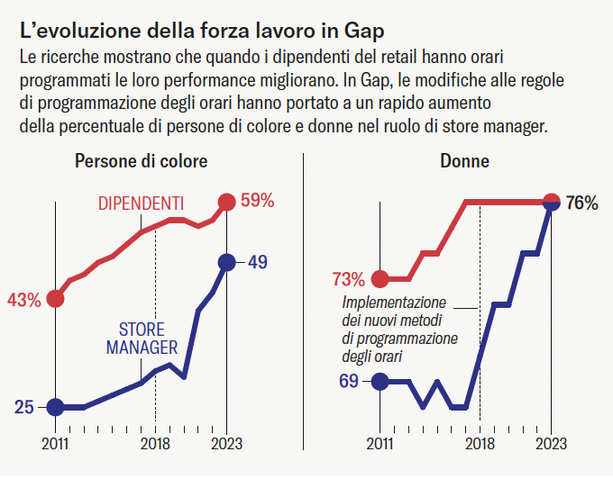 Possiamo osservare questo effetto nei dati interni di Gap, che l’azienda ha iniziato a rendere pubblici nel 2011. Analizzandoli, abbiamo riscontrato una crescita costante della percentuale di persone di colore impiegate, con l’eccezione di una temporanea inversione durante la pandemia. Tra gli store manager, la crescita è accelerata sensibilmente dopo il 2018 (periodo pandemico a parte), quando tutte le innovazioni nella programmazione degli orari sono state implementate. Dal 2011 al 2017, la percentuale di store manager appartenenti a minoranze etniche è passata dal 25% al 29%, mentre fra 2017 e 2023 dal 29% al 49% (si veda il box “L’evoluzione della forza lavoro in Gap”).