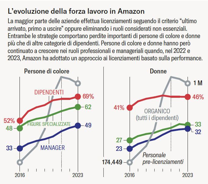 I licenziamenti hanno messo a dura prova la cultura della performance di Amazon. Molti esperti si sono chiesti se i tagli basati sulle valutazioni della performance avrebbero avuto gli stessi effetti dei licenziamenti tradizionali, che spesso colpiscono prima i neoassunti e i reparti considerati “non essenziali” come customer service, ufficio legale e DEI. È noto che questo approccio tradizionale porta a un’emorragia di donne e persone di colore. Sarebbe accaduto lo stesso con i licenziamenti collegati alle performance?